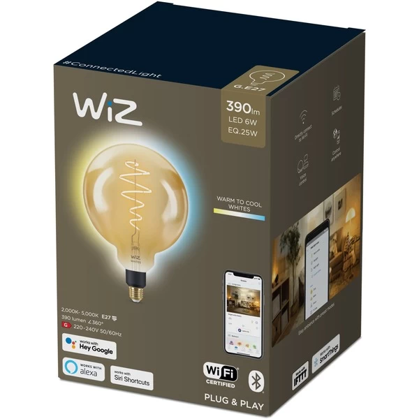 Tolles Design, anpassbare, weiße Beleuchtung: Die Whites LED-Lampe Amber G200 E27 von WiZ ist ein smartes Leuchtmittel, das in eine E27-Standardfassung eingeschraubt wird und steuerbares, warm- bis kaltweißes Licht erzeugt. Es kann per App oder Sprache gesteuert werden, wobei voreingestellte Lichteinstellungen für verschiedenste Stimmungen bereits in der App hinterlegt sind. Auch die Erstellung von automatischen Routinen ist möglich. Ein zusätzliches Gateway wird nicht benötigt. Diese LED-Lampe überzeugt außerdem mit tollem Design dank rundem Glas-Leuchtkörper, bernsteinfarbener Tönung und Filament-Leuchtelement.Art.-Nr.: 1848109